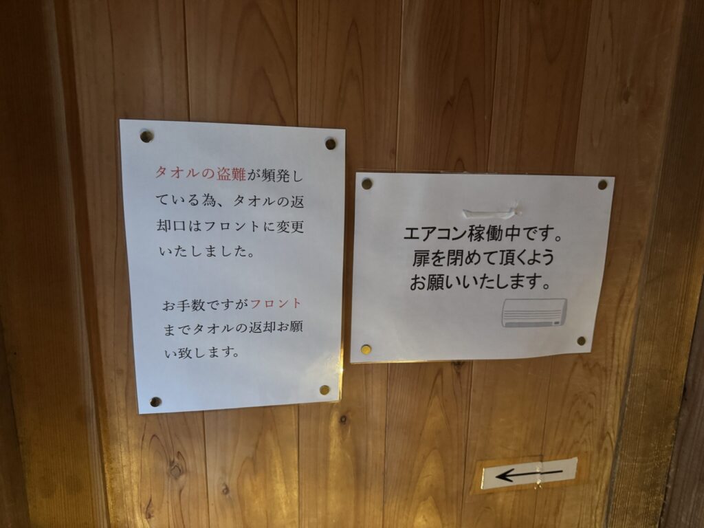 貸しタオル利用者はフロント(受付)で返却を忘れずに。