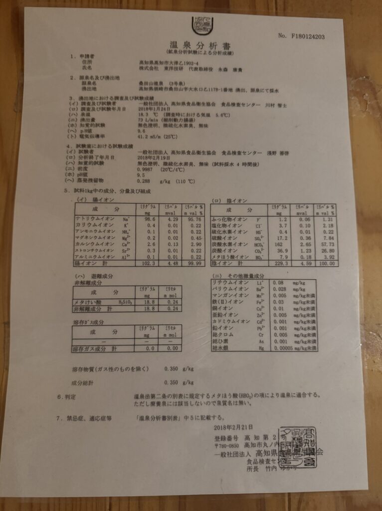 見えづらいですが、脱衣所内に温泉分析書があったので載せておきます。